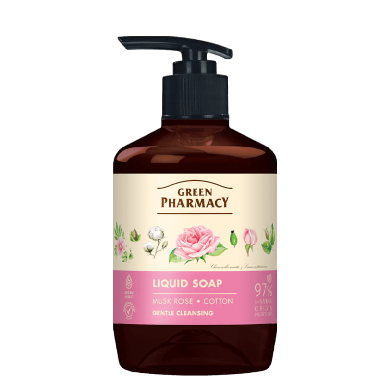 Mydło w płynie Green Pharmacy łączy w sobie skuteczne oczyszczanie z troską o skórę. Dzięki olejkowi z róży piżmowej i ekstraktowi z bawełny, delikatnie myje, nie wysuszając skóry. Codzienne stosowanie pozostawia dłonie gładkie, miękkie i subtelnie pachnące.